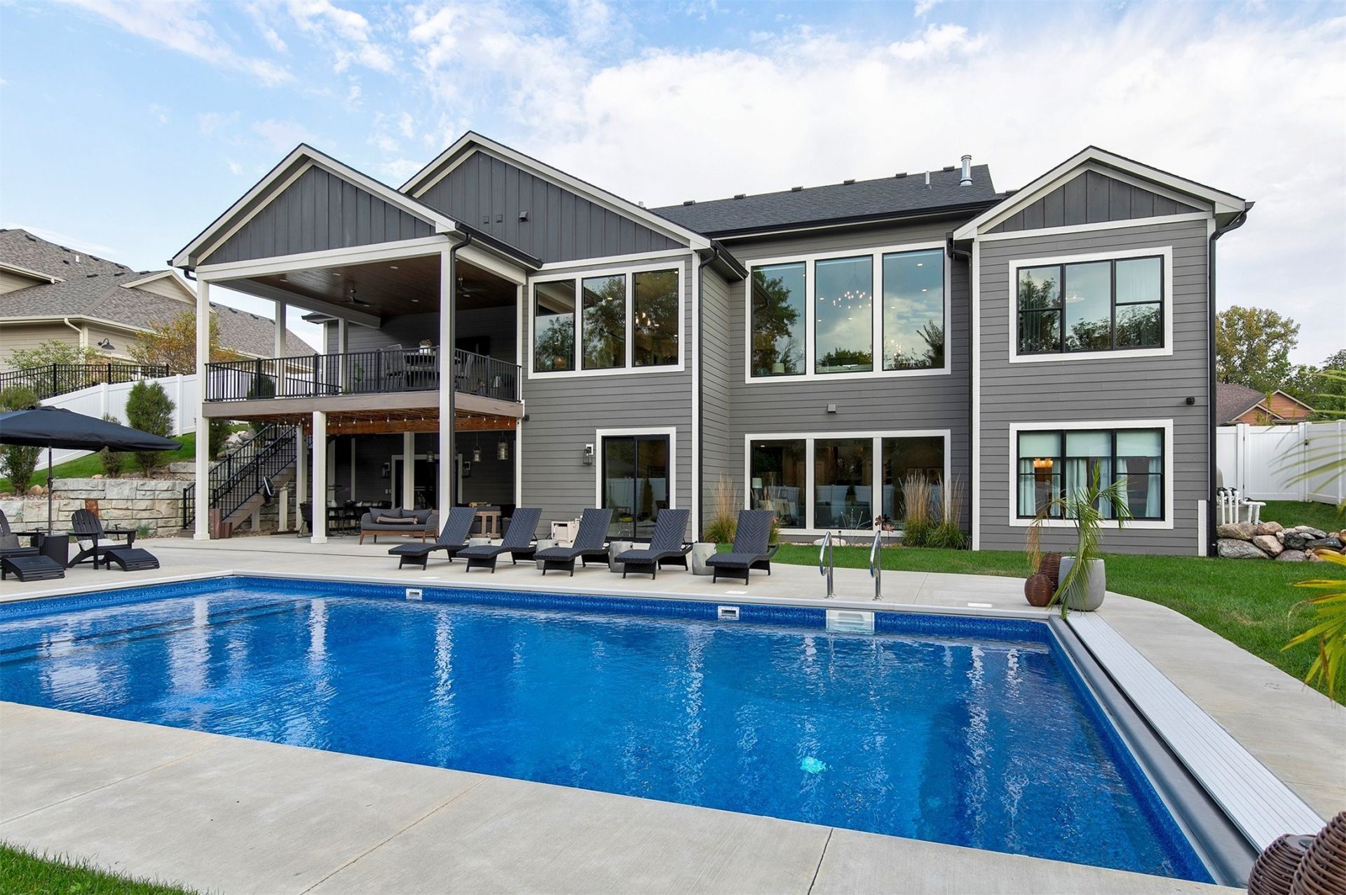 Step into a Clifton-designed masterpiece nestled in an exclusive cul-de-sac surrounded by other luxury homes. This custom ranch spans over 5,000 sq. ft. of pure elegance, blending warmth and modern design. Its moody exterior sets the tone for the extraordinary features inside. Offering 5 bedrooms and 4 baths, this home is designed for both comfortable family living and impressive entertaining. The gourmet kitchen, complete with abundant cabinetry and an oversized pantry, overlooks the expansive main floor and flows seamlessly into the dining area or out to the 680 sq. ft. covered deck. The primary suite is a true retreat, with massive windows flooding the space with natural light, a spa-inspired ensuite featuring a private stool room, huge walk-in shower, and an incredible walk-in closet. Exquisite trim details throughout showcase superior craftsmanship. The walkout lower level is an entertainer's dream?boasting a wet bar, oversized family room, dining area, and three additional bedrooms with baths, perfect for family or guests to enjoy their own private space. A bonus room offers the ideal spot to escape indoors after hot pool days. Outdoors, the luxury continues with a sparkling pool and sun ledge, basketball court, and inviting dining space, creating the ultimate backyard oasis. With a 4-car garage, thoughtful layout, and meticulous attention to detail, this home is more than a house?it's a lifestyle. Truly a must-see!