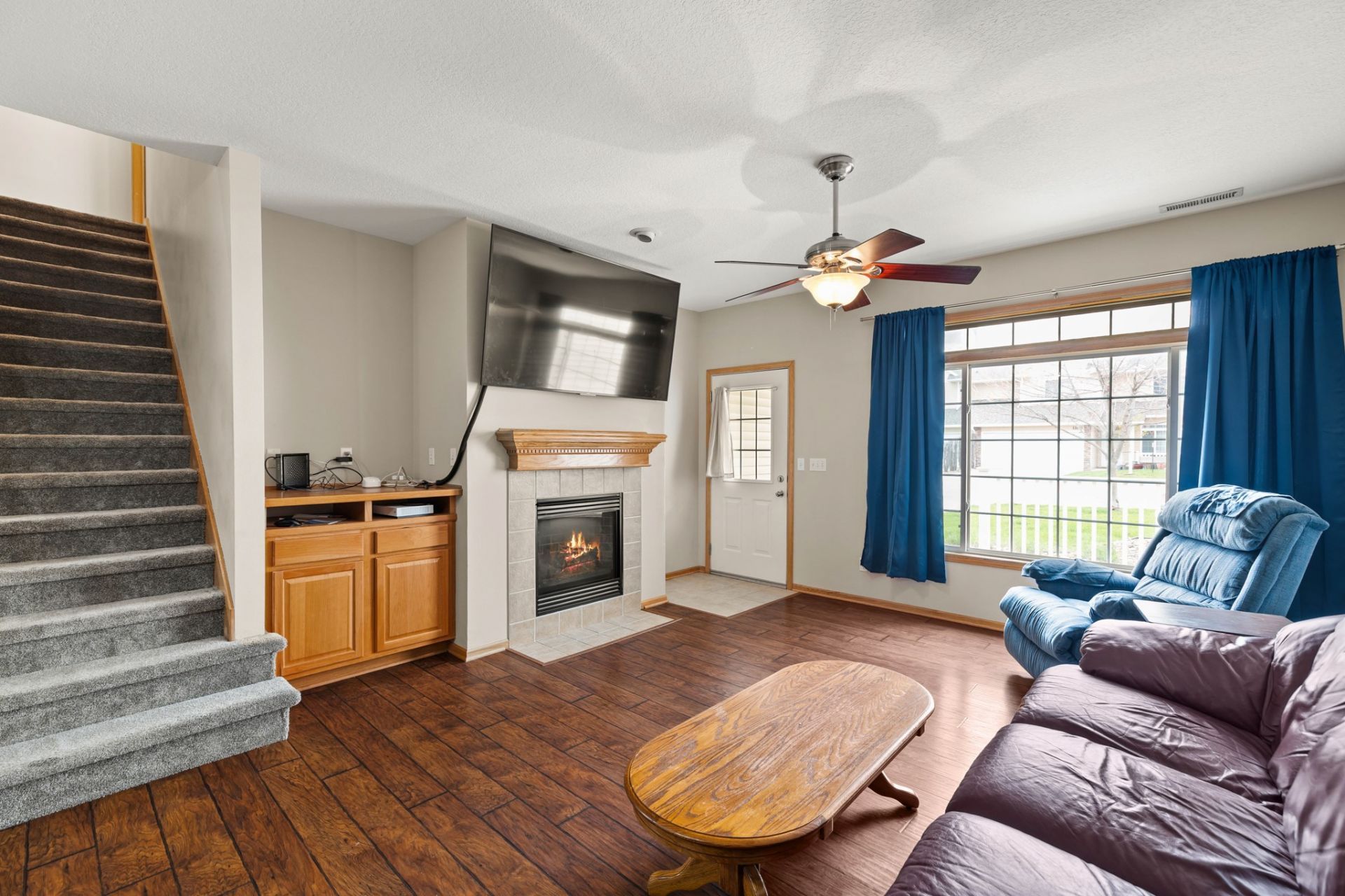 Well-maintained townhome featuring a spacious open-concept layout ideal for everyday living and entertaining. The inviting living room offers a gas fireplace, built-in cabinetry, and hard surface flooring, flowing seamlessly into the dining area and kitchen.