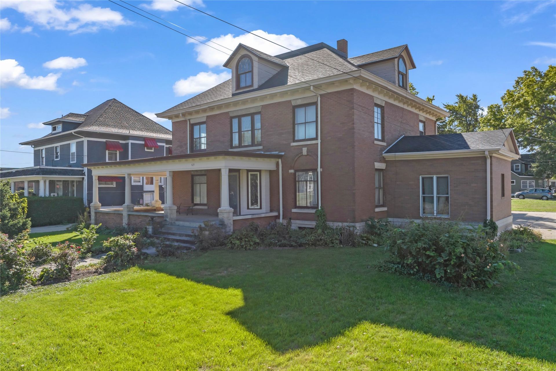 Step inside this stunning historical home offering over 3,600 square feet of charm and character. From the moment you arrive, you'll be amazed by the beautiful brick exterior, inviting wrap around porch, and timeless details that set this property apart. Inside, the craftsmanship shines with original trim that has been carefully preserved for more than 100 years. The main level features two spacious living rooms along with a bedroom that includes a private ensuite, complete with a tiled shower, glass door, and an oversized walk-in closet. Upstairs, you'll find four additional bedrooms, a full kitchen, and a conveniently located laundry room, giving you incredible flexibility for extended family, guests, or multi-generational living. The third level is a blank canvas, ideal for a playroom, home office, or hobby space customized to your lifestyle. Outside, the oversized two-car garage and generous corner lot provide both practicality and curb appeal. With its rich history, beautiful woodwork, and abundance of space, this home offers endless opportunities to make it your own!