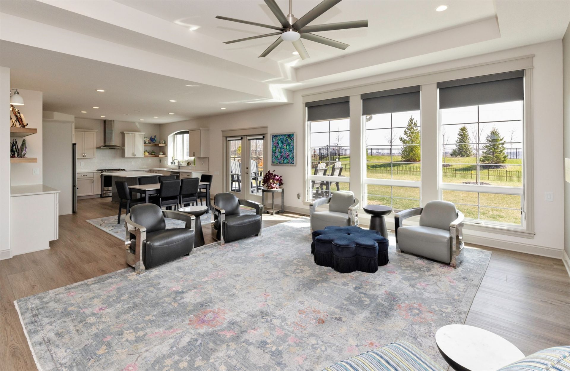 Welcome to this better-than-new zero-entry ranch in Kimberley Estates! Step inside to the airy, open living spaces with large windows across the back of the home. The open concept kitchen-dining-living area is the heart of the home, featuring painted cabinets accented by stained floating shelves, gas stove with stainless hood vent, center island, pantry, and the sink on the perimeter overlooking the backyard. Just off the kitchen, you'll find a mudroom entry from the garage and a separate laundry room for added convenience. Outdoor living is easy with a ground-level covered patio with outdoor speakers and beautifully landscaped, fully fenced backyard with black aluminum fencing. The primary suite includes a zero-entry tile shower, dual sinks, and seamless access to the walk-in closet. A front flex room off the entry is perfect for a hobby room, office, or additional living space. The finished lower level features LVP throughout the rec room, wet bar, and living area. There are 2 spacious bedrooms and a full bath + ample storage space. Additional extras include: 36 doors (except pantry), garage heater, custom window blinds throughout, and a deep freeze in the basement. With zero-entry at the front door, back door, and garage, this home combines comfort, style, with 2 golf courses nearby and easy access to I-80!